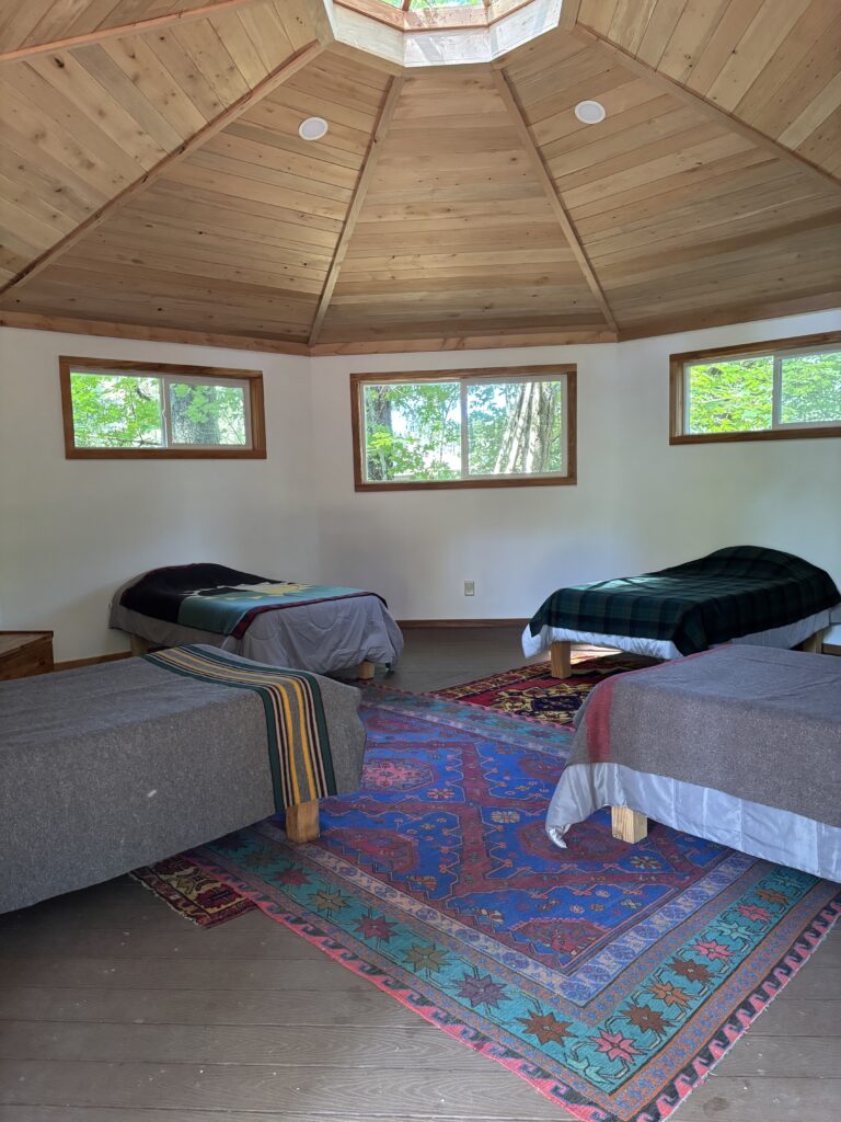 The Octahut is our largest dwelling. It can be arranged with up to five twin beds and is near the outdoor shower.