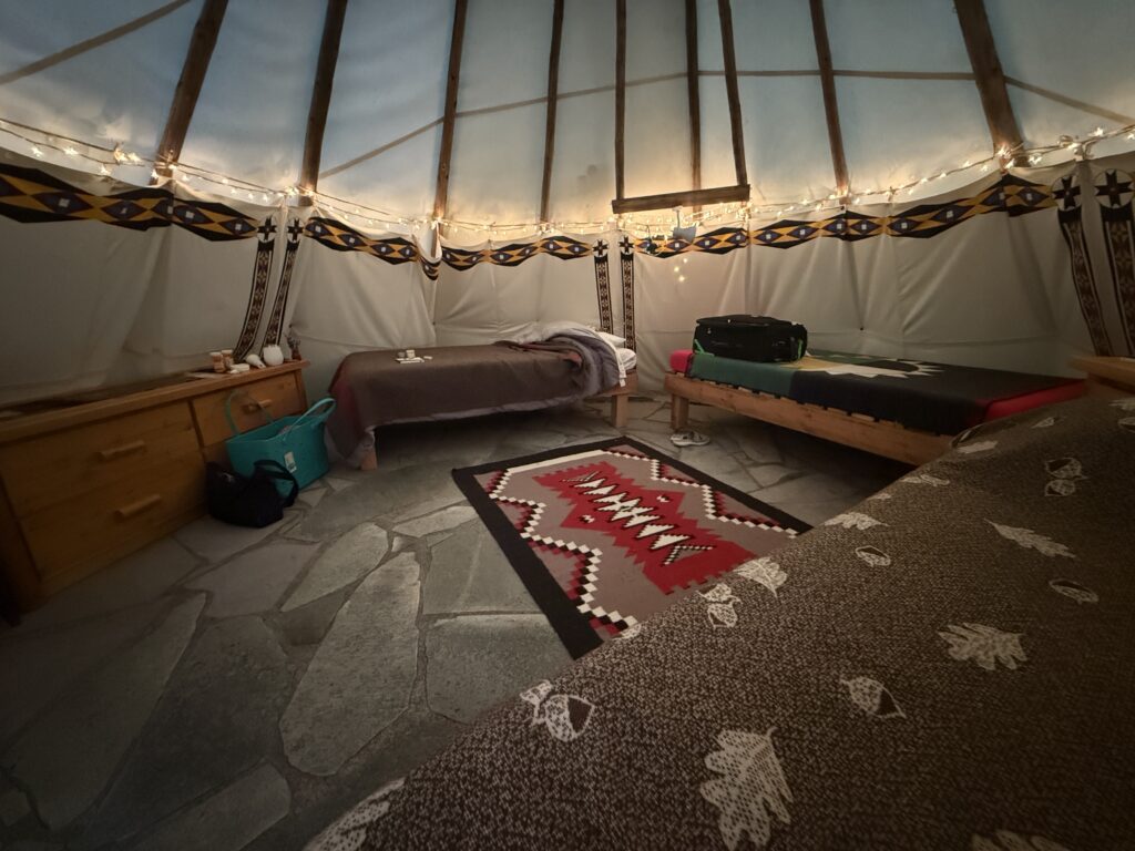 One of our largest tipis, near the edge of the forest. The interior can be arranged with three twin beds or one queen and one twin. Price per night: $170 for two people, breakfast included. A third single can be added for $85.