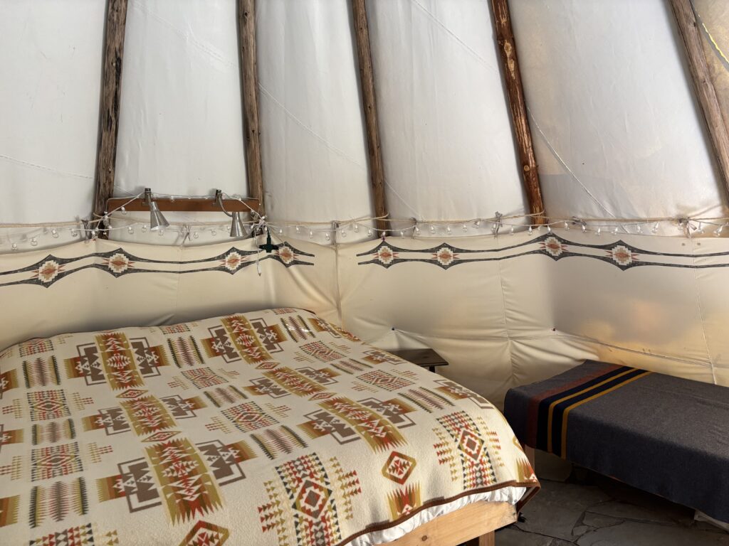 Chief Joseph is located in the meadow with sounds of the splashing creek. Close to the heart of the action, this tipi is near the outdoor kitchen, bathhouse, and patio. The bed is a full and sleeps two. Price per night is $150, breakfast included.